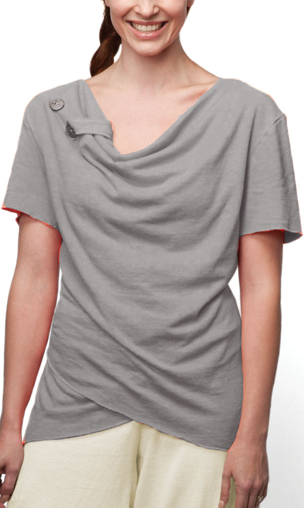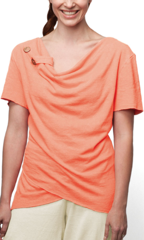 This trending short sleeve top has a flattering cowl neck line with faux button tab accents and a cross over hem at the bottom.