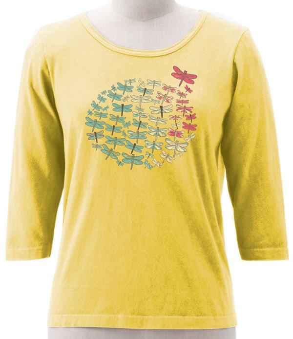 Our Dragonfly circle ladies tee features a stunning design of dragonflies in a circle. has 3/4 length sleeves, a scoop neckline, and fabulous fit. This great transitional piece as the seasons move from summer to fall, and fall to winter.