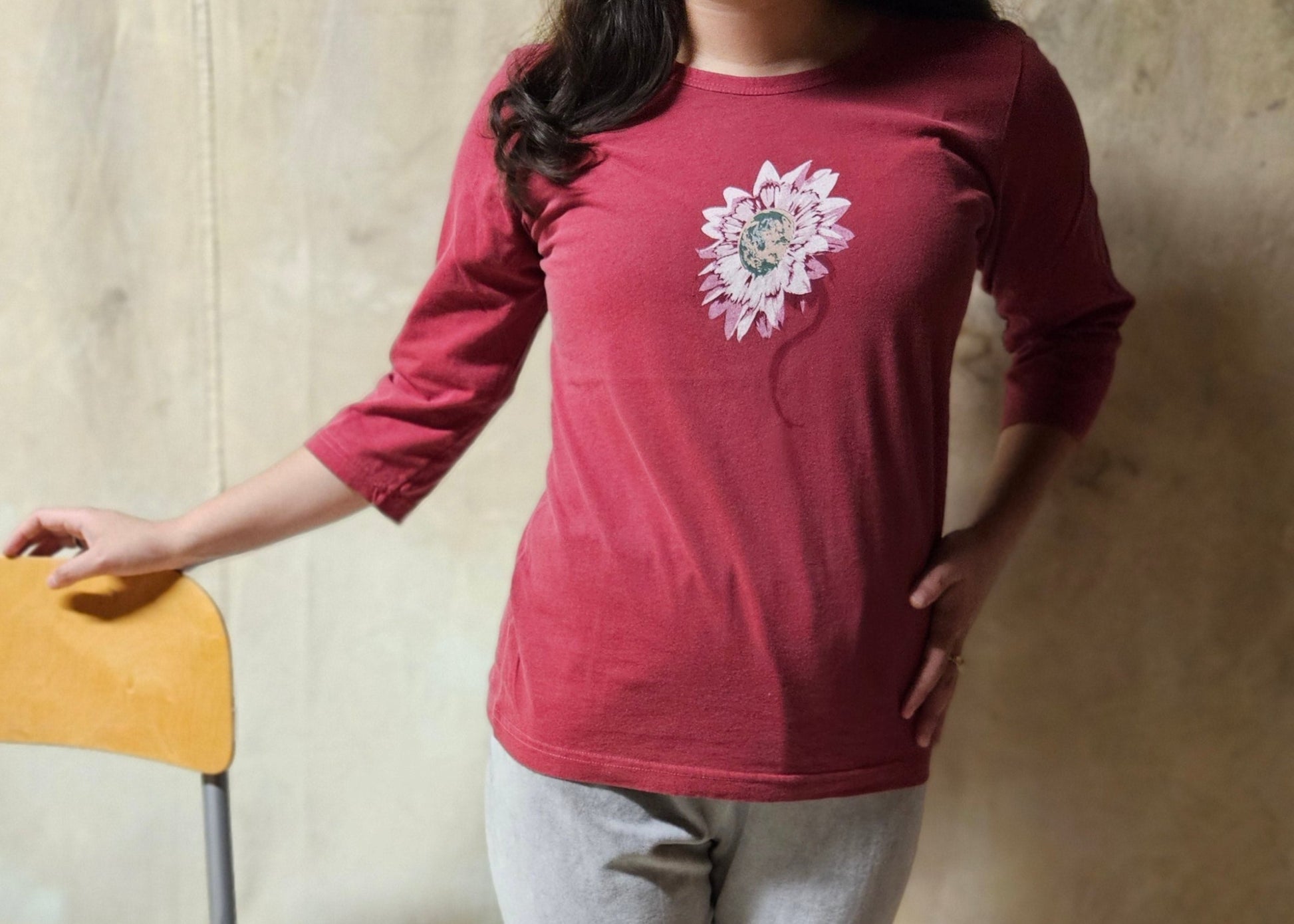 Earth Flower Imprint on Made in USA Organic Cotton 3/4th Sleeve Ladies Tee