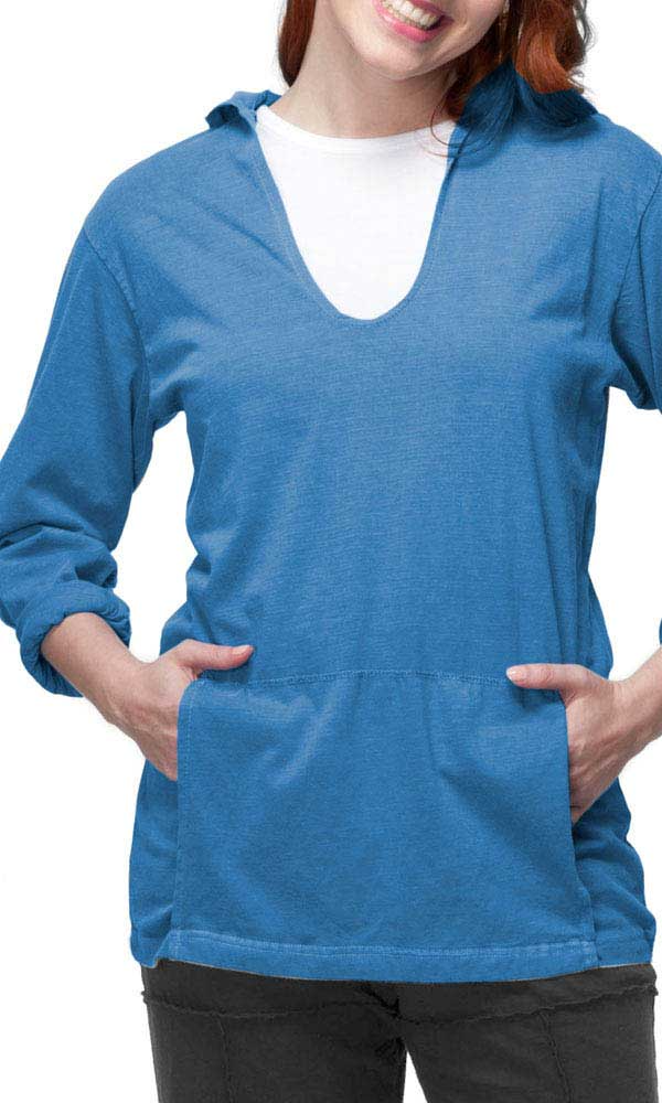 This light weight long sleeve hoody features a handy front kangaroo pocket. Throw this on after your work out or on a windy day for a comfortable casual look. It’s a great layering piece over one of our tees or tanks for the cooler spring evenings.
