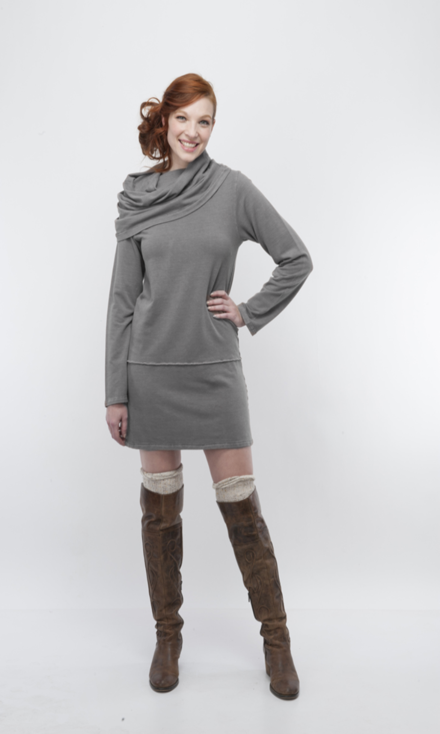 This classy cowl neck tunic/dress has multiple uses. It can be draped over the shoulders, worn as a cowl neck, or as a hooded tunic/dress. We narrowed the sleeves and finished them with a hem. The body also now has a finished hem.