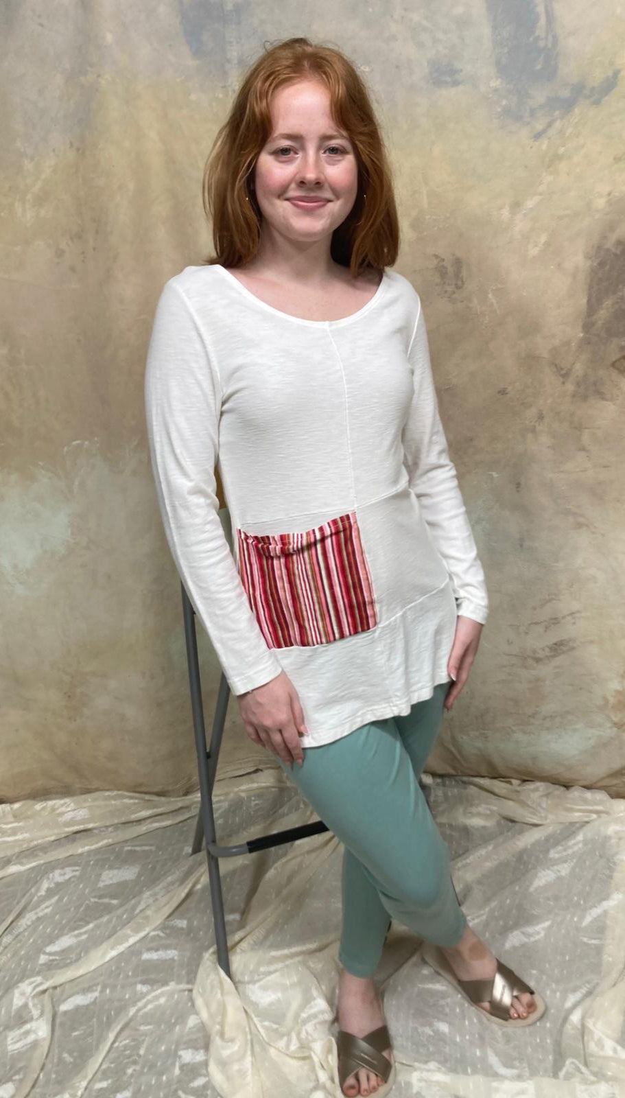 Add a pop of personality to your everyday look with this charming long sleeve top. Made from soft, breathable organic cotton, it drapes comfortably while offering all-day ease. The design features a simple scoop neckline and a bold striped patch linen pocket in warm red and cream tones — that adds a playful, artisanal touch.