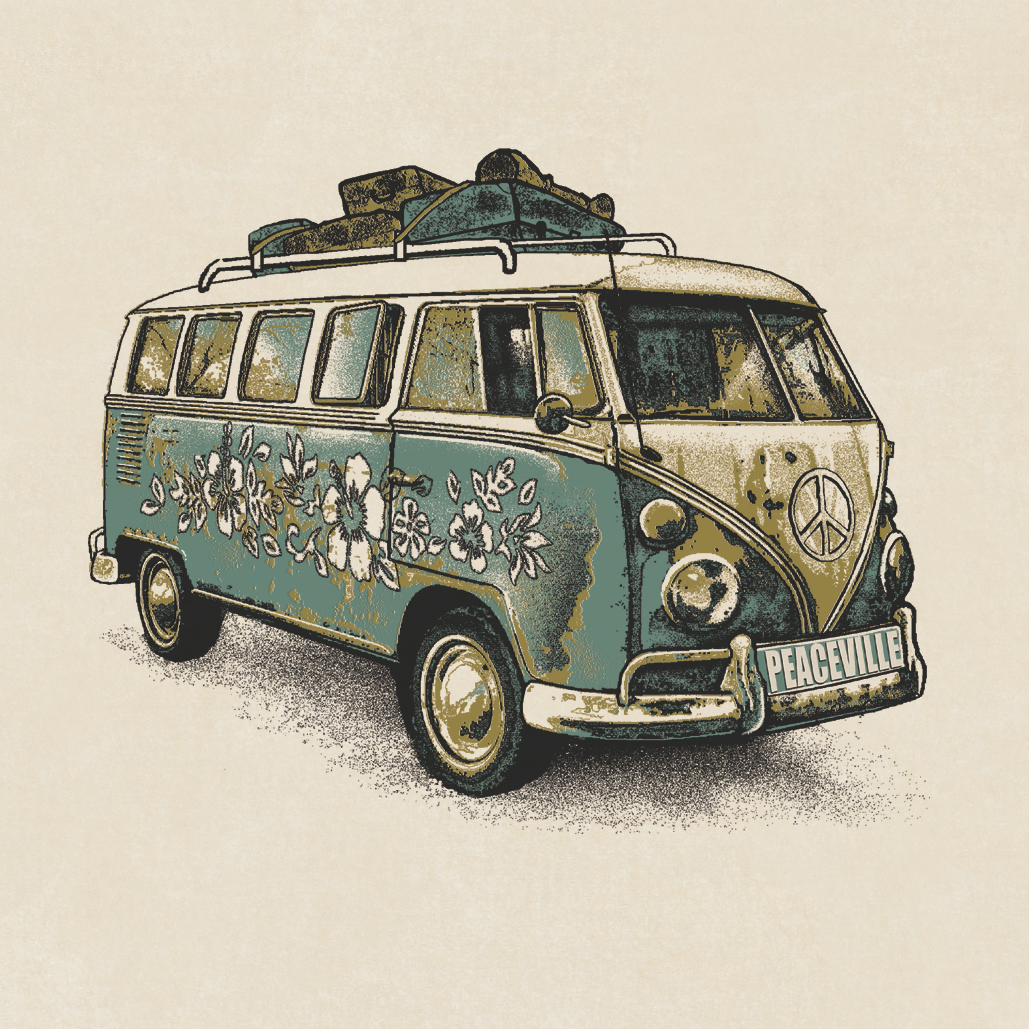 Who doesn't love the look and nostalgia of a classic car? With retro flowers and peace symbols, transport back to the 60's! This design suggest a road trip full of adventure.