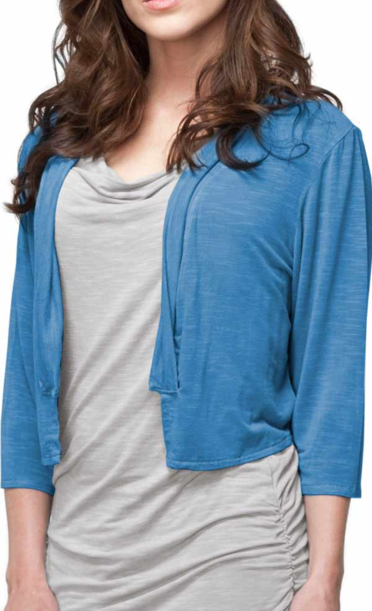 This crop bolero style jacket is a fun piece to finish off most any outfit. With ¾" length sleeves and placket detail, this flattering lighter piece moves easily from a day at the office to a night out.