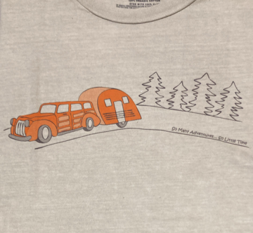 Hit the road in style with this playful retro tee featuring a woody station wagon towing a camper—perfect for those who know there are so many adventures but so little time!