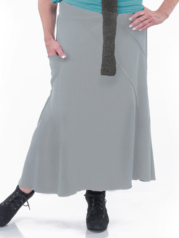 This bias cut full length skirt has diagonal decorative seaming to the outside with a right side patch pocket. With a wide lycra waist band that can be worn up or rolled over, this skirt can even double as a strapless dress.
