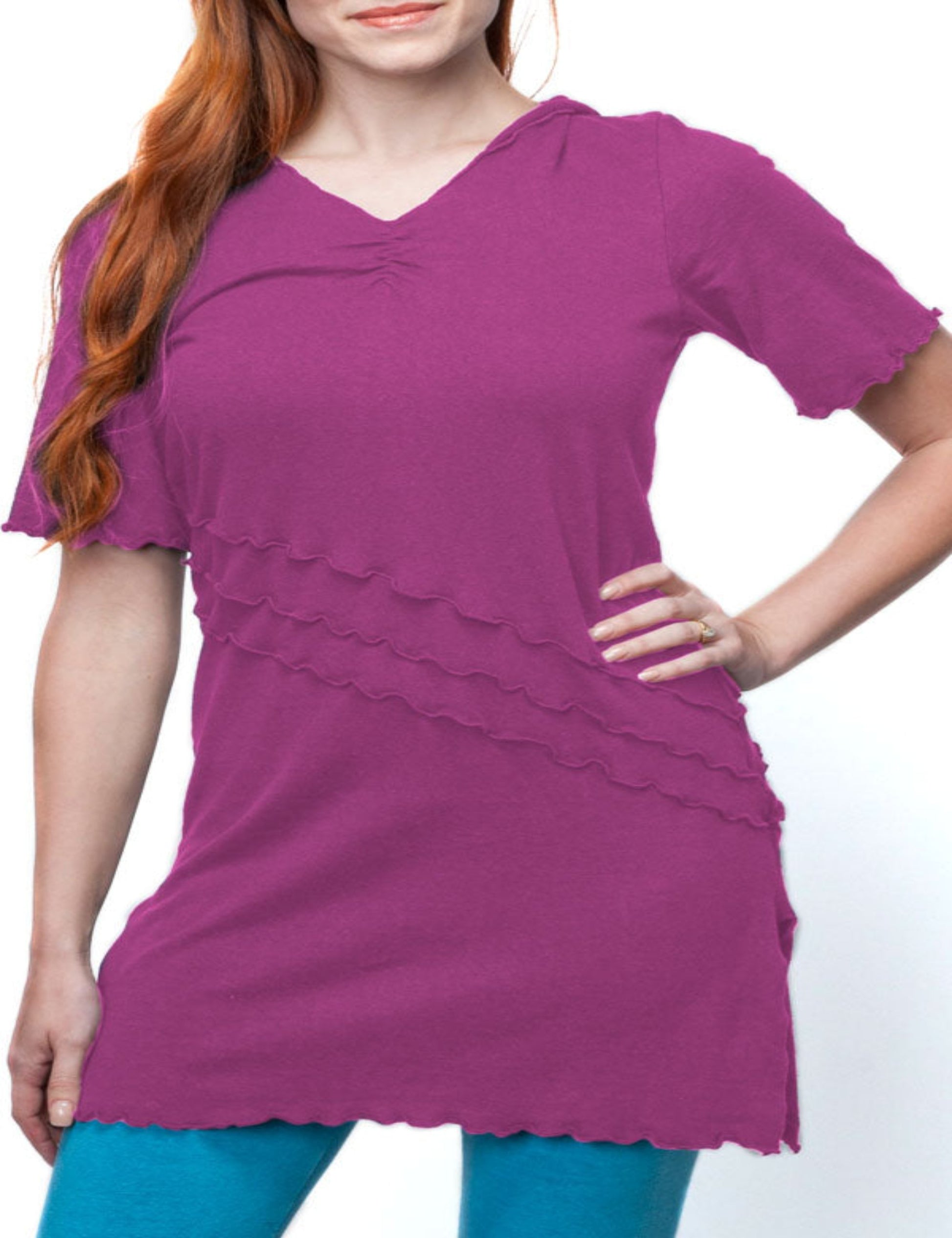 This fun Hemp/Organic Cotton hooded tunic with elbow length sleeves features flattering diagonal, reversed seaming accent across the hips, V-neckline with ruching accent, side vents, and lettuce edging around all outer hems. Wonderful look paired over leggings or jeans.